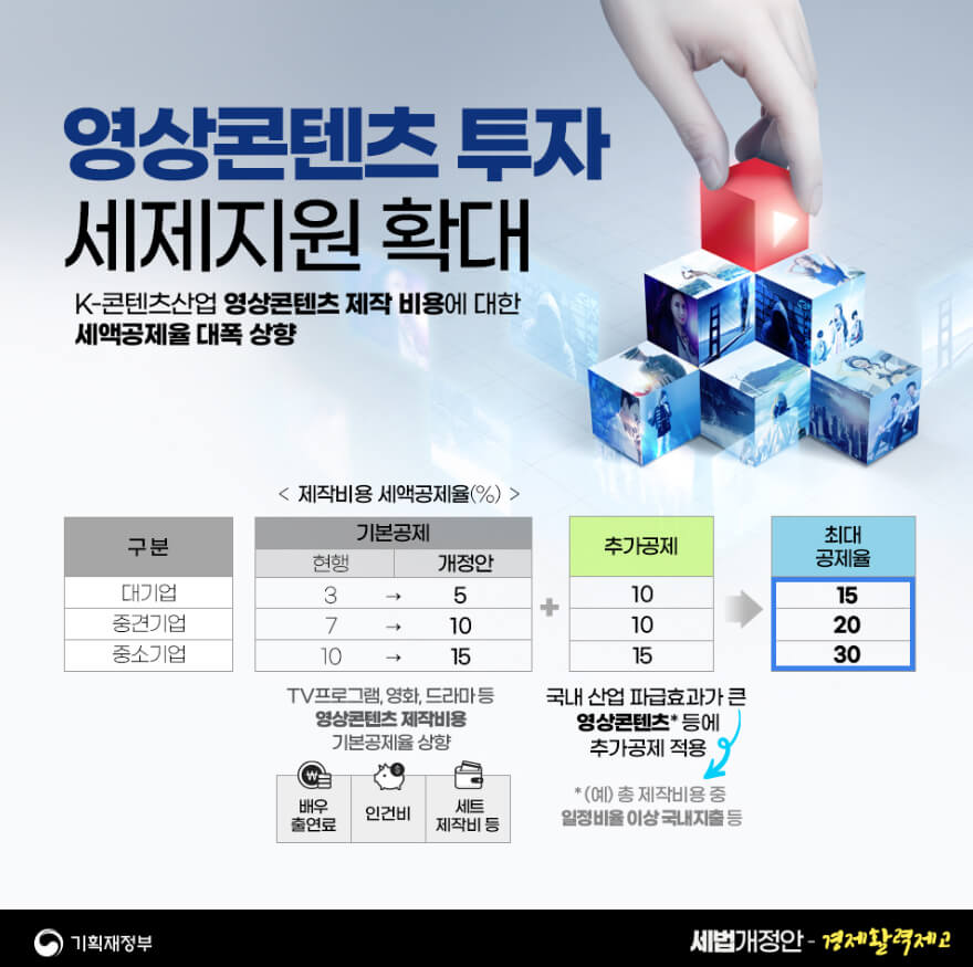 k- 콘텐츠산업 영상콘텐츠 제작 비용에 대한 세액 공제율이 대폭 상향됩니다.