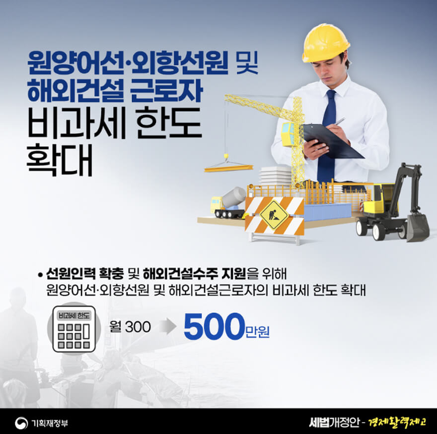 ◇비과세 한도 확대 *일반 국외 근로자 : 동일 *외항선, 원양어선 선원 및 해외건설근로자 : 월 500만원 |